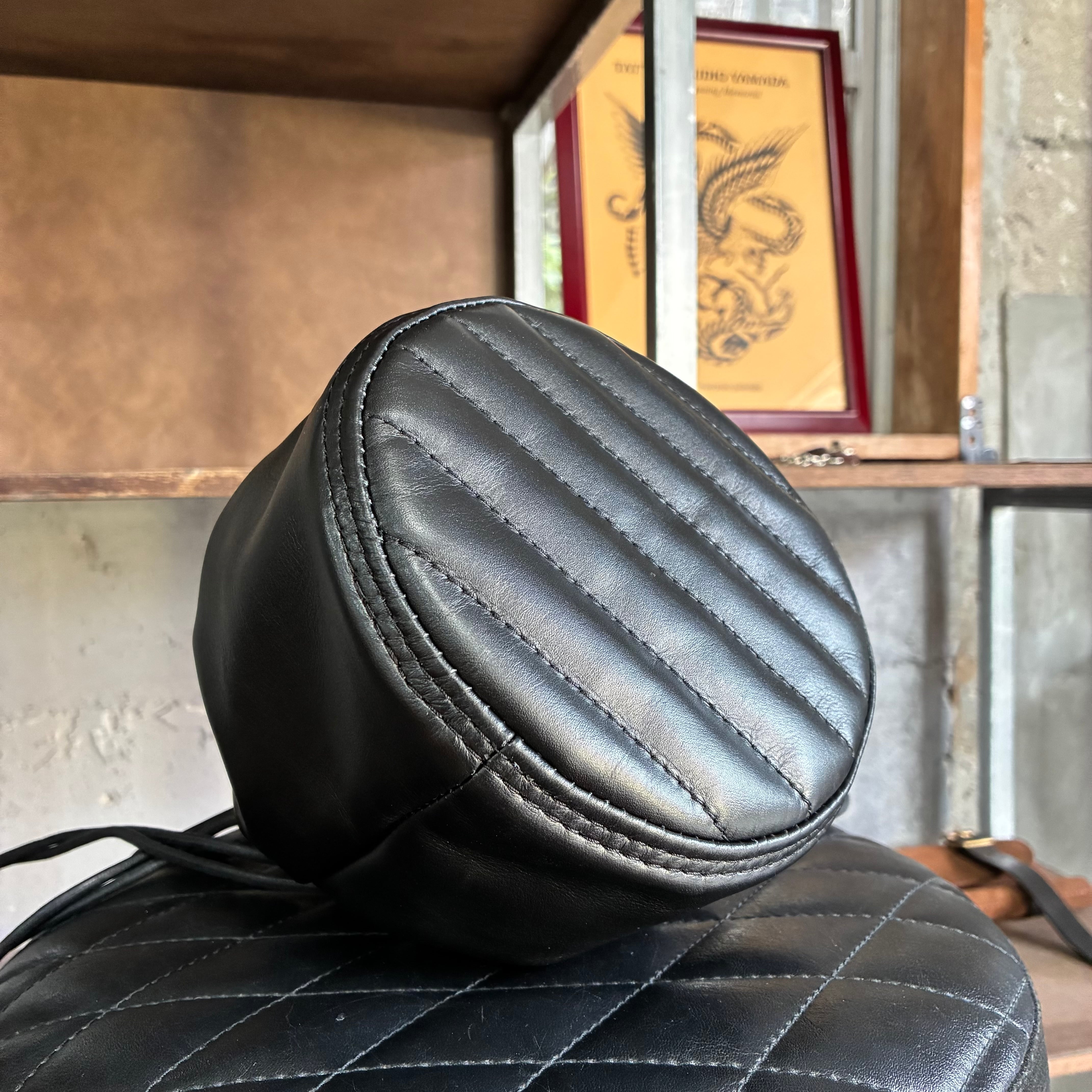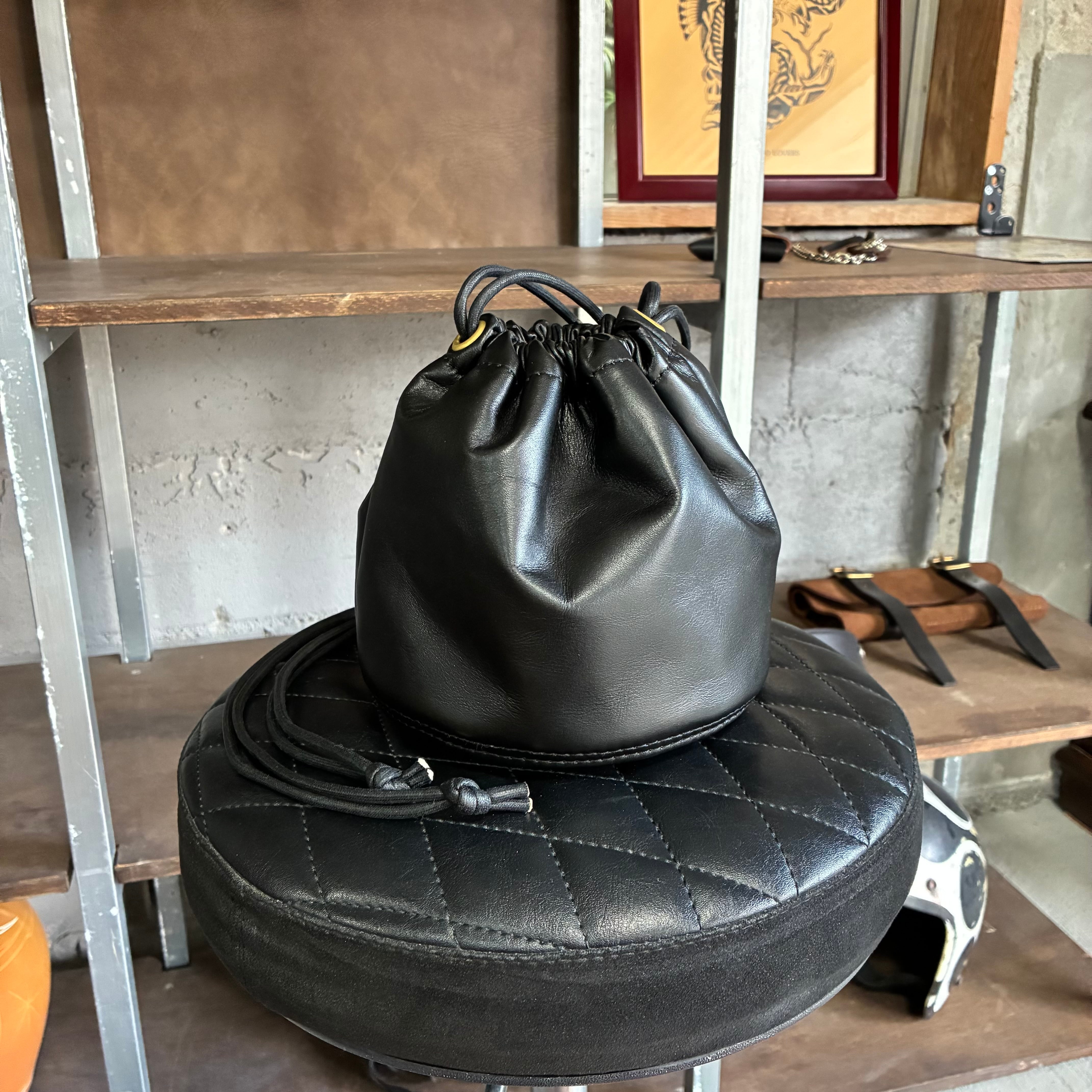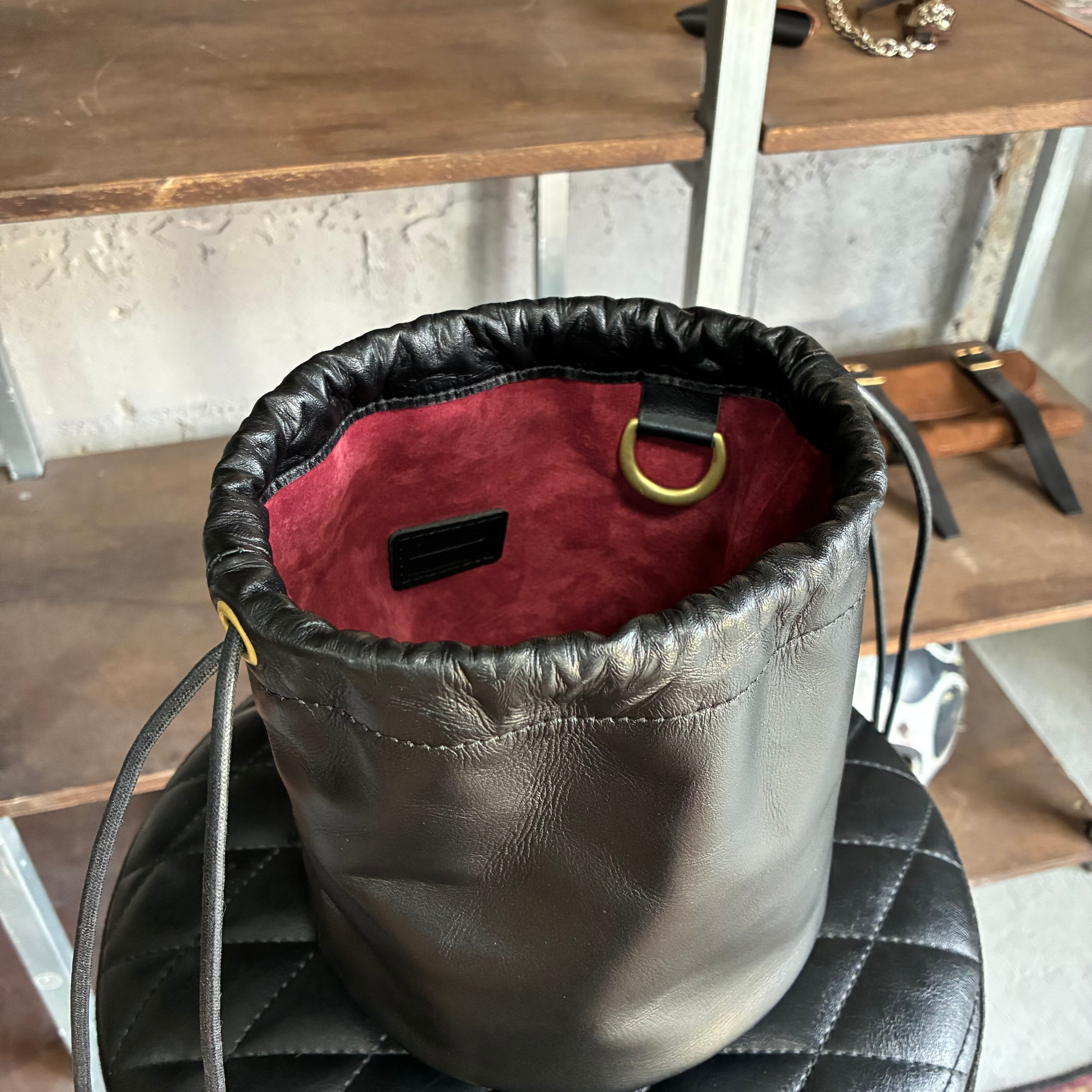 レザージャケットなどにも使用される上質な国産スムースレザーで仕上げたドローストリングバッグ。