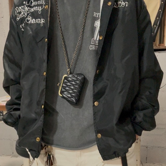 ※こちらの商品は受注生産になります。納期まで2週間程かかりますので予めご了承ください。 裏表でキルティングとタックロールを組み合わせたクレイジーパターン。 アメカジ、バイカースタイルにマッチする様に無骨な雰囲気で仕上げたがま口ウォレット。 クレジットカードが入るサイズ感で、札も二つ折りで収納出来るのがポイント。 チェーンは最長108cm、フックで調節可能なので斜め掛けや、短くして首元から掛けるなど、その日のスタイルや用途でお使い頂けます。 キルティングとタックロールのクレイジーパターンになっております。 素材 表 カウレザー 中 ピッグスキン 金具 アンティークサティーナ H12cm(金具含む)×W13.8cm チェーンの長さ 最長108cm(フックで調節可)
